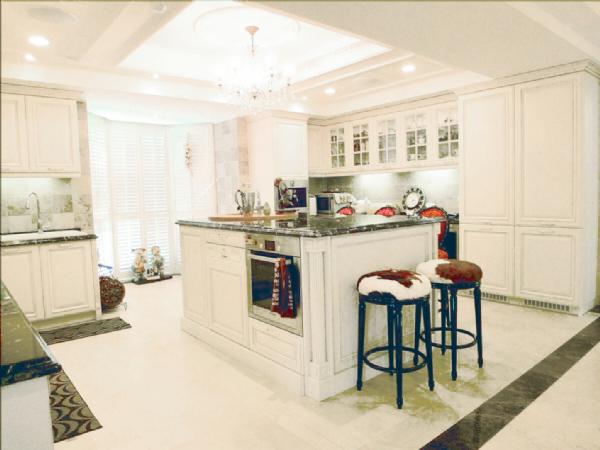 為了讓廚具與室內歐洲奢華古典風格充分融合,在煙罩正面及中島側面特 別加入了純手工雕花柱頭及花飾,中島檯面為加強奢華感,特別以集成材實 木,鑲崁於花崗石檯面,在不同厚度的層次間,呈現了整體廚具的精緻工藝。