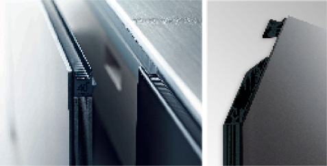 防潮、抗刮、不易變形的環保可回收材質凹型條紋導水結構搭配一體成型背版精密45度角鋁框接合技術搭配特殊螺絲隱藏工法。