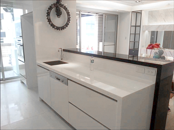 ◎門板/檯面:晶采為主體、搭配H90木紋門板。檯面以三星兩種顏色(黑+白)