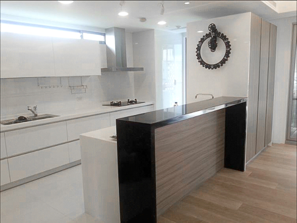 主葉太太很喜歡歐洲義大利式的設計風格,簡潔俐落為重點。希望整體廚房不要有太多線條,佐以燈光輔助能成現實上格調,廚台強調要有流線感且要兼具收納功能。在配色上希望加入木紋元素與亮面白做結合,不要太單調。