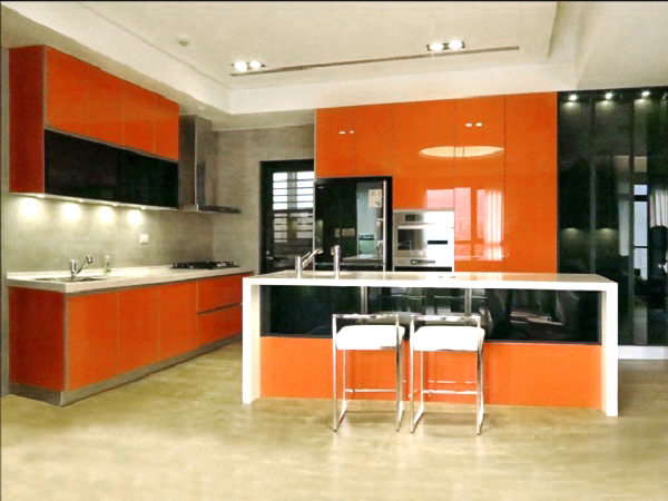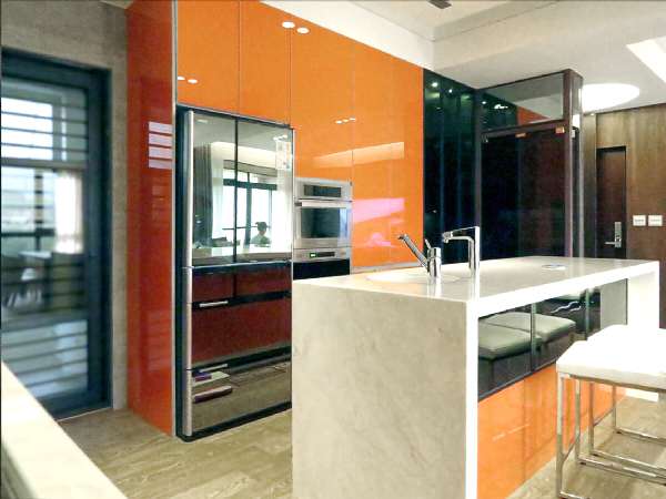 業主對於流行接受度很開放,特別喜好歐洲時尚的元素,所以在廚房顏色配置上我們大膽地採用今年各領域皆流行的橘色作為主色系,但單一的橘色形成視覺的重壓感,不耐久看,故以橘、黑、白配色運用。