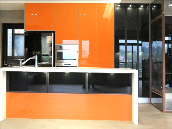 ◎門板檯面:采鑽A橘色為主體、搭配D型鋁框黑玻璃 石紋人造石