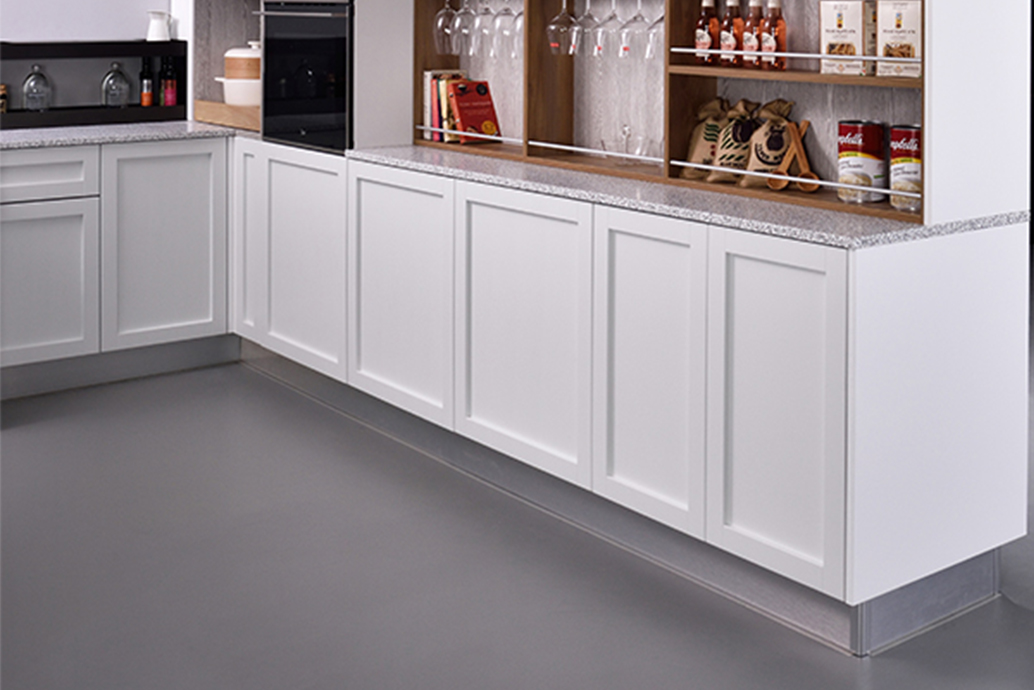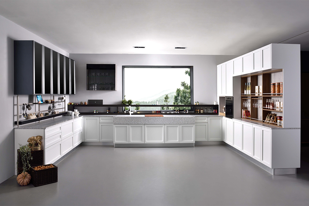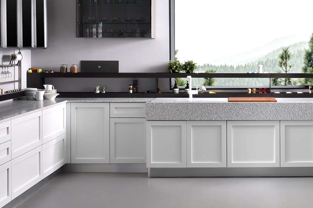 新古典框門設計,可取代傳統霧面烤漆的表面質感,更為友善環境;俐落線條下的隱藏把手,讓視覺更加具一體感。